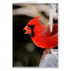 Männlicher Kardinal hockt auf Eis, da Eiszapfen über seinen hellen roten Federn hängen. New Hampshiretierbild gefangen genommen an einem Wintertag im Februar.