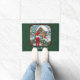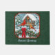 Ein Paar nördliche Rote Kardinäle auf einem schneebedeckten, weißen Zaun mit Weihnachtsgarland und einem kräftigen roten Bogen. Sie feiern an einem Wintervogelleger, der mit Weihnachtsglocken, Band und heiligen Glocken geschmückt ist. Realistisches Kunstwerk von der Künstlerin Crista S. Forest.