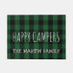 Trendy, aber klassisches grünes kariertes rustikales Wohngestaltunggeschenk für rvers, pensionierte Reisende, Lagerbewohner und Naturliebhaber ist diese personalisierte Fußmatte, die glückliche Lagerbewohner mit einer Schablone für das Addieren des Familiennamens unten in den weißen Buchstaben lesen. Gegen einen populären Hintergrund des karierten Musters des schwarzen und grünen, cozy Büffels oder des auch angerufenen Holzfällers kariert oder der Karos. Einzigartiges Ruhestandsgeschenk, auch. Seien Sie zu Hause vor einem RV oder einem gemütlichen Blockhaus recht und vervollkommnen während der Winterurlaubjahreszeit.