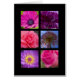 Leere Gruß-Karte, die eine Fotocollage von sechs rosa und lila Blumen kennzeichnet.
