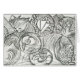 Drypoint Bild einer Katze mit Bergen dahinter und Traumbilder rund herum.
