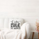 Ein modernes, modernes, weißes Kissen mit den Worten "Katzen herrschen die Welt", das mit weißen Whiskys, Katzenkratzern, einer winzigen Maus und einer kleinen Pfote geschmückt ist.