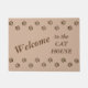 Diese niedliche Fußmatte hat eine Spitze und Unterseitengrenze der schmutzigen Tatze druckt über einem Hintergrund des hellen Tan. Die Mitte sagt z.Z. Willkommen zum CAT-HAUS im Braun, aber kann zu allem leicht besonders angefertigt werden, das Sie möchten.