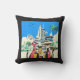 Kopfkissen in einer Illustration von drei stilvollen, als Touristen stehend gekleideten Katzen vor einer futuristischen Stadt. Die Architektur erinnert an die Science-Fiction-Ästhetik der Mitte des Jahrhunderts. Die Katzen halten Kameras, Karten und tragen Lanyards, was ein Abenteuer nahe legt. Palmen und ein leuchtend blauer Himmel sorgen für eine angenehme Urlaubsatmosphäre.
