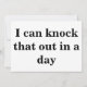 Standard weiße Karte mit "No Problem!" vorne und "Ich kann das in einem Tag herausklopfen" auf der Rückseite. Der Text ist auf beiden Seiten in einem großen schwarzen Schriftart.