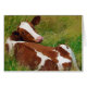 Eine niedliche junge Ruderkalb lockt auf einer grünen Wiese, um ihre Kuh zu kauen, und dreht ihren blockigen Kopf zurück, um zu sehen, wer oder was ihn gestört hat. Dies war ein Farbfoto eines braunen und weißen Holstein oder einer fresichen Milchkuh, digital mit Pinselstrichdetails optimiert, um einem Gemälde zu ähneln.