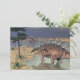 Zwei Kentrosaurus-Dinosaurier, die am Strand neben Sand und Bäumen am grauen Tag spazieren