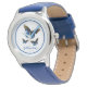 Diese klassische Kinderuhr wird mit einem Lederriemen in Blau mit hübschem Schmetterlingskunstdruck gezeigt. Passen Sie dieses Objekt an oder kaufen Sie, wie es ist. Bild