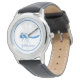 Die klassische Lederuhr wird mit einem schwarzen Lederriemen mit niedlichem Blue Dragonfly-Kunstdruck gezeigt. Passen Sie dieses Objekt an oder kaufen Sie, wie es ist. Bild