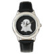 Diese Kinderuhr wird in Edelstahl mit schwarzem Gesicht und schwarzem Lederband mit einem Halloween-Geisterprint gezeigt. Passen Sie diese Uhr an oder kaufen Sie, wie es ist.