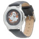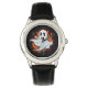 Diese Kinderuhr wird in Edelstahl mit schwarzem Gesicht und schwarzem Lederriemen mit niedlichem Halloween-Gespensterdruck gezeigt. Passen Sie diese Uhr an oder kaufen Sie, wie es ist.