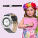 Kinderuhr aus Edelstahl mit schwarzem Lederarmband. Dekorativer schwarzer Hintergrund weiß Design und eine Zahl-Uhr Gesicht. Fügen Sie Kunst, Farbe hinter dem Gesichtsbild der Uhr oder behielt das Aussehen. Kontaktieren Sie admin@giftsyoutreasure.com für Hilfe und direkte Links zu Produkten, die angepasst werden können.