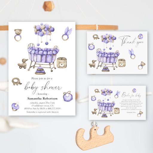 Die Einladung zeigt Aquarell, Babywickel, Kinderzimmer in Form lila Rundwolken, Kinderspielzeug: Nageelefant, Räderente, Teddybär, Hase, Bib, Schnuller, Pyramide.