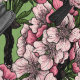 Handgezeichnetes Vektormuster mit Zweigen von Kirschblüten und Hühnervögeln