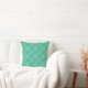 Die blau und grün umrissenen Plätze sind in hellgrün gehalten, eine dickere grüne Linie, die sich in der Mitte der Quadrate kreuzt. Die grünen Linien weben sich über und unter der Kontur der Quadrate. Der Hintergrund ist blau. Das solide grüne Quadrat befindet sich neben einem Quadrat mit helleren grünen und blauen Dreiecken. Die Rückseite des Kissens ist massiv blau.