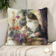 Ein Kissen mit Dekoration und ein schönes Gemälde einer Katze, das neben einem Fenster sitzt und das Sonnenlicht ins Zimmer strömt.