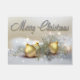 Herrliche goldene Weihnachtsbaumverzierungen auf einem metallischen silbernen Hintergrund mit Goldausläufern und -bändern und schneebedeckter weißer Kiefer verzweigt sich, sie umgebend. Twinklelichter heben die Wörter frohen Weihnachten in einem Diamantschnitt-Schriftart mit GoldKontur hervor.