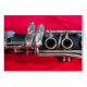 Ein naher Teil des unteren Gelenkteils einer Klarinette. Schwarz und Silber kontrastieren schön mit dem roten Hintergrund! Ideal für den Klarinettisten in deinem Leben.