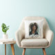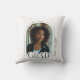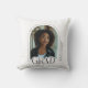 Ein modernes Abschluss-Sake-Kissen, das das Foto des Absolventen zeigt, zugeschnitten auf einen eleganten Bogen mit GRAD Typografie leicht über dem Foto. Im Bogen befindet sich der Text für das Klassenjahr. Auf der Seite, vertikal, ist der Name und die Schule des Absolventen. Klassisches Schwarz-Weiß-Design. © Kimbellished, LLC