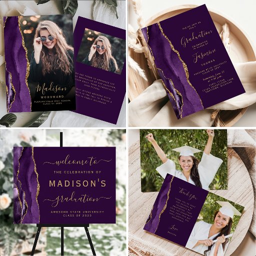 Diese trendige 2025 Graduierungsparty lädt mit einem Aquarellbild einer agate Geode in lila Farbtönen mit Imitats Gold Glitzer Highlights ein. Das Wort "Abschluss" und der Vorname des Absolventen erscheinen in elegantem, goldfarbenem Handschriftenskript auf einem lila Hintergrund pflaumenweise, zusammen mit den Einzelheiten des Party in serifenlosen Sans und kursiven Schriftart. Die Rückseite der Karte ist lila.