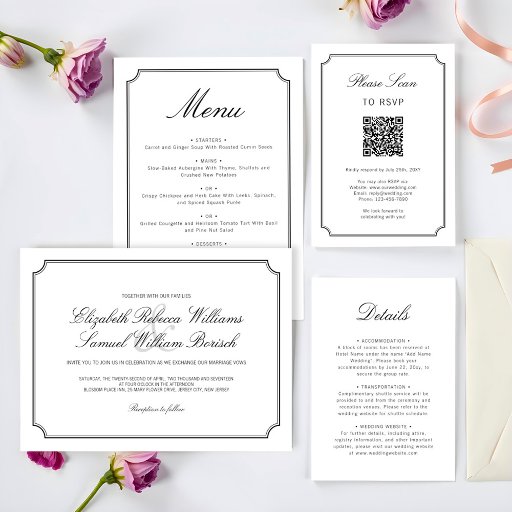Passen Sie diese schöne stilvolle, einfache aber schöne und elegante horizontale Einladung Hochzeit. Weißes Design mit schwarzem Rahmen und klassischem Text.