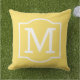 Stilvolles und klassisches quadratisches Kissen mit Akzenten im Außenbereich mit einem Monogramm-Initial mit einem schlichten, weißen Rahmen mit hellgelber Hintergrundfarbe. Passen Sie den Hintergrund an, um sich mit Ihrer Außendekoration abzustimmen.