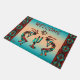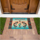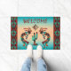 Personalisieren Sie diese einzigartige "Eine von einer Art" Südwest Kokopelli Doormat! Es verfügt über zwei Kokopelli, die Flute spielen und um einen Kaktus unter der Sonne auf einem türkisfarbenen und orangen Sonnenuntergang tanzen...umgeben von einer Südwestgrenze in Türkis, Orange und Schwarz! Das ist ein originelles Kunstdesign des Künstlers Kerry Miller.