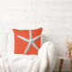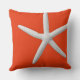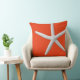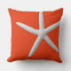 Dieses moderne orange-orangefarbene Kissen an der Küste besticht durch tropische, weiße Sternfische und eignet sich hervorragend für das Strandhaus, die Hütte am Strand, für Wassersport, Küstendekoration oder Wohngestaltung zum Thema Strand oder für den Ozean. Foto der Korallen und Design © von TK Goforth, alle Rechte vorbehalten.