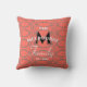 Stilvolles lebendes korallenrotes Farbfamilienmonogrammdekor Throwkissen mit dunklem aquamarinem Wirbel und weißer und schwarzer mutiger Typografie. Benutzen Sie einfach die Funktion "personifizieren dieser Schablone", um Ihren Familiennamen, Initiale und hergestelltes Datum einzufügen.