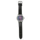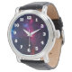 Eine Uhr mit einem blauen, rosa und schwarzen Fantasiebild kosmischer Räume mit Sternen und kluger Nebel.