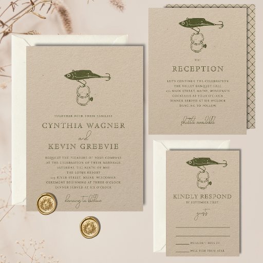 Das perfekte, einfache Angeldesign für das Paar, das am Angeln interessiert ist! Wenn Sie nach einer Hochzeitsfeier zum Thema Angeln suchen, die noch modern und elegant ist, dann schauen Sie nicht weiter! Dieses Angeldesign zeichnet sich durch einen rustikalen moosgrünen, marineblauen oder klassischen schwarzen Angellohn aus, der mit Hochzeitsringen am Angelhaken befestigt ist. Dreh auf den Rücken, um ein lustiges Fischnet-Muster zu sehen, um das Angellook zu vervollständigen. Beenden Sie Ihre Hochzeitssuite mit passenden Beilagen! Karo in unserer Sammlung, um deine Hochzeitsfeier abzuschließen. In der Liste angezeigt: Einladung von Empfängen für Hochzeiten