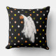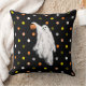 Ein sonniges Halloween-Kissen mit kreativem Trick-oder-Heilgeister, der einen Kürbis hält.