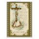 Der crucified Jesus hängt an einem Kreuz. Unterhalb des Kreuzes ist eine offene Bibel und ein Set Rosenbeetperlen. Der Hintergrund hat Blumen und Wolken. Die Ränder der Karte haben Goldfiligrees geprägt.