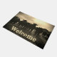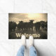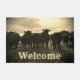 Diese sepiatfarbene Willkommenstafel hat ein Bild von schwarz-weißen Kühen in einer Weide mit einer hellen Sonne hinter ihnen.