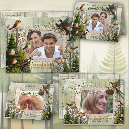 Eine wunderschöne Fantasy Art Illustration in einem modernen Stil zeigt eine Vogelfamilie unter verschiedenen großen, hellen, mittleren und dunkelgrünen Pinienbäumen mit cremigem Hintergrund und Blume.