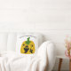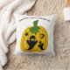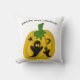Auf diesem Kissen befinden sich orangefarbene Kürbis, schwarze Geister, Sterne und Monde mit den Worten "Happy Halloween" über dem Design.