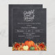 Ein Imitat rustikalen Chalkboard Hintergrund. Die Einrichtung ist mit Kürbissen und orangen und gelben Blumen geschmückt. Personalisieren Sie die Party-Details und fügen Sie sie hinzu. Text-Skript: Dankbar und gesegnet. 1 Blatt = 1 Einladung mit Druckkante bis Kante.