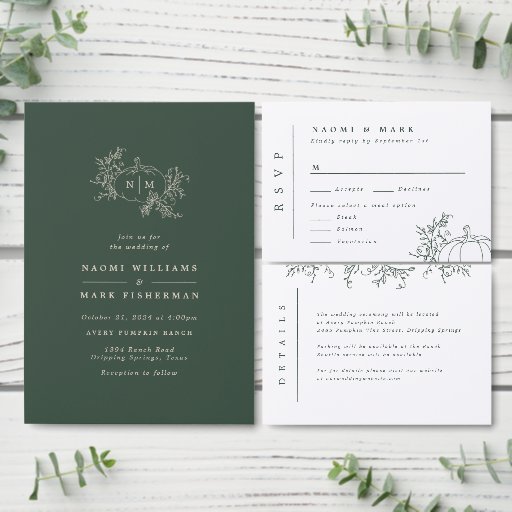 Elegante Kürbislinie zeichnend mit Weinreben, Botanicals und einem Hochzeitsmonogramm.