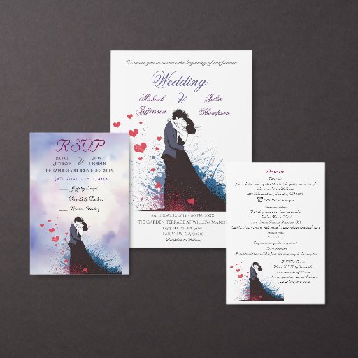 Dieses elegante und künstlerische Design verbindet Romantik mit einem modernen, ausdrucksvollen Design. Das Herzstück ist eine Silhouette eines Ehepaares, das leidenschaftlich Liebe und Einheit symbolisiert. Das Kunstwerk zeichnet sich durch einen kreativen Splash-Effekt in tiefblauen, roten und schwarzen Farbtönen aus, der eine zeitgenössische und dynamische Touch verleiht. Geschützte Herzen verstärken das romantische Ambiente, während der stilvolle Kalligraphie-Schriftart eine zeitlose Eleganz verleiht. Die Einrichtung ist sauber und dennoch ausdrucksvoll, sodass sie sich ideal für Paare eignet, die ein einzigartiges, etwas unkonventionelles und künstlerisches Hochzeitsmotiv gewollt haben. Das Bild verbindet traditionelle Eleganz mit frischer, moderner Ästhetik und eignet sich somit für kreative, böhmische oder romantische Hochzeiten.