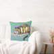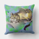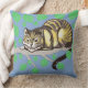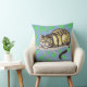 Dieses Design zeigt meine lächelnde Cheshire Cat auf der Grundlage von Tenniels original Schwarz-Weiß-Illustration, in einem Baum vor blauem Hintergrund, mit grünen Blätter. Die Rückseite des Kissens zeigt, wie die Cheshire-Katze verblasst.