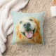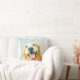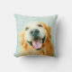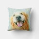 Dieses Kissen kennzeichnet ein Aquarell eines lächelnden golden retrieverhundes, auf einem blauen Hintergrund.