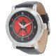 Lacrosse Shooter - Rot und Schwarz . Gefesselt, gecockt und zum Fels bereit. Silhouette des Lacrosse-Player-Haltesticks, inmitten eines Schießens auf das Ziel. Rundemblem-Design in Schwarz, Grau und Rot. Lacrosse Player Uhr. Lacrosse Timepiece.