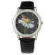 Spaß Armbanduhr mit einem Foto einer Daisy mit einem Ladybug auf schwarzem Hintergrund mit gelben Punkten für die Stunden.
