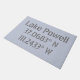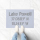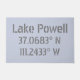 Breiten- und Längengraden GPS-Kartenkoordinaten für das beliebte Erholungsgebiet am Powell-See, der an Utah und Arizona grenzt. Moderner, urbaner grauer Schriftart auf hellblau-grauem Hintergrund.