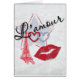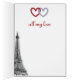 Liebe mit einer französischen Drehung. Rot und blauer Entwurf mit Eiffelturm, Stern, Herzen und Lippenstiftkuß.
