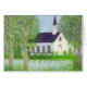 Pastell einer weißen Landkirche auf einem Hügel. Ein Teich neben ihm reflektiert die Blues, die Rottöne, die Gelbs, die Orangen und die Purpur der befleckten Glasfenster.
