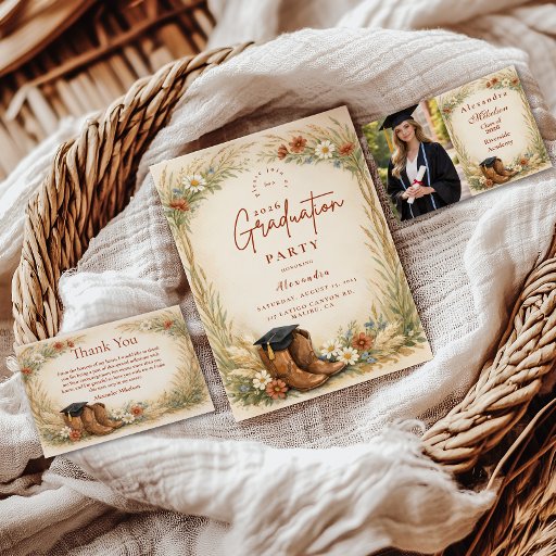 Feiern Sie Ihren Absolventen mit einem warmen, western-inspirierten Design, das klassische Cowgirl-Stiefel, zarte Wildblumen und weiche Präriegräser enthält, die das Layout einrahmen. Die erdige neutrale Farbpalette aus Beige, Salbei, staubigem Blau und warmem Terrakotta schafft eine verfeinerte Ranch-Ästhetik, die sich sowohl modern als auch zeitlos anfühlt. Perfekt für landliebende Absolventen, Rodeo-Mädchen oder jeden, der unter offenem Himmel große Träume hat. Eine schöne Mischung aus rustikalem Charme und eleganten botanischen Details für eine unvergessliche Abschlussfeier.