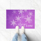 Eine hübsche und moderne Tür "Let It Snow" mit einem trendigen festlichen Muster mit weißen Schneeflocken auf lila Hintergrund. Diese Türmatte ist leicht zu personalisieren mit Ihrem eigenen Namen oder Text, sodass es ein perfektes Weihnachtsgeschenk für Liebende. Der lila Hintergrund ist mit detaillierten weißen Schneeflocken geschmückt, die die Oberfläche bedecken. Jede dieser Schneeflocken wurde mit feinen Linien gestaltet, um einen extravaganten Spitzeneffekt zu erzielen. Der Text ist in einem anmutigen, fließenden kursiven Skript geschrieben, das eine personalisierte und einladende Touch hinzufügt. Der Gesamtstil ist charmant und fröhlich, mit einem klaren Urlaubsthema, das es zu einer wunderbaren Ergänzung zu jedem Zuhause während der Festsaison macht. Ideal, um Wärme und Feiertagsstimmung mit individueller persönlicher Touch zu verbreiten.