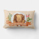 Dieses saisonale Kissen hat ein türkisfarbenes Abendessen mit einem Banner, das "Let's Get Stuffed" in weiß sagt. Es gibt hellorangen Gingham Hintergrund. Die verwendeten Farben sind olivgrün, orange, grün, rot und gelb.