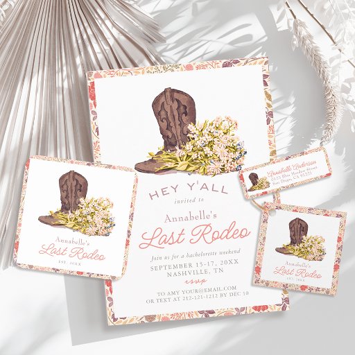Feiern Sie das letzte Rodeo der Braut im zeitlosen Stil! Dieses bachelorette-Wochenende-Geschenktag bietet einen handillustrierten, Vintagen Cowboy-Stiefel gepaart mit einem romantischen Bouquet, alle gerahmt in einem eleganten Blumenrahmen. Es ist in sanften Farbtönen wie Rosa, lila und hellorange gehalten und ist ein raffinierter Akt im klassischen Cowgirl-Design von Nashville - ideal für eine Braut, die eine Touch rustikaler Romantik Liebe.